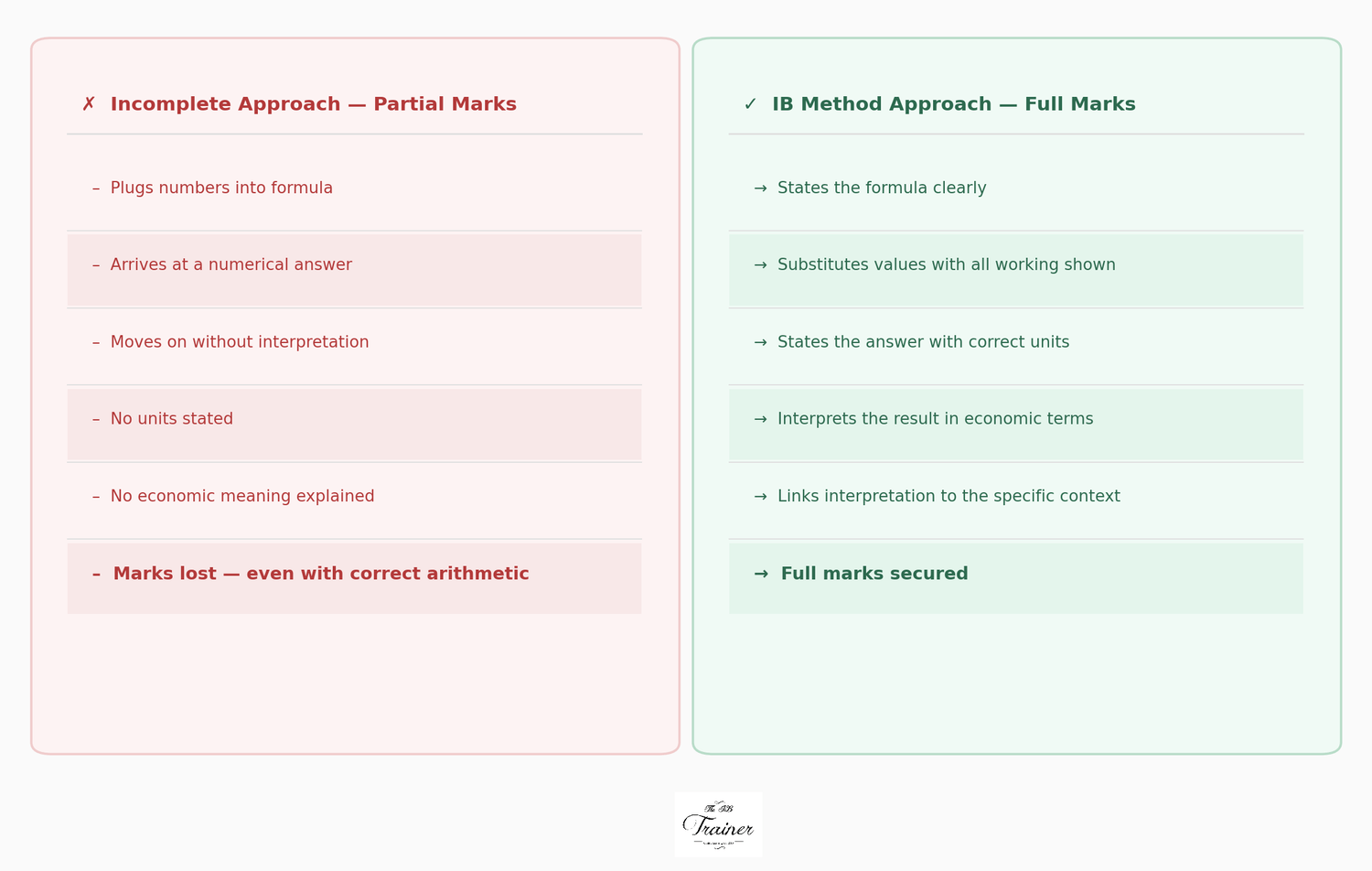 IB Economics marking schemes reward the process, not only the result. Here is the difference between partial marks and full marks on every calculation question: