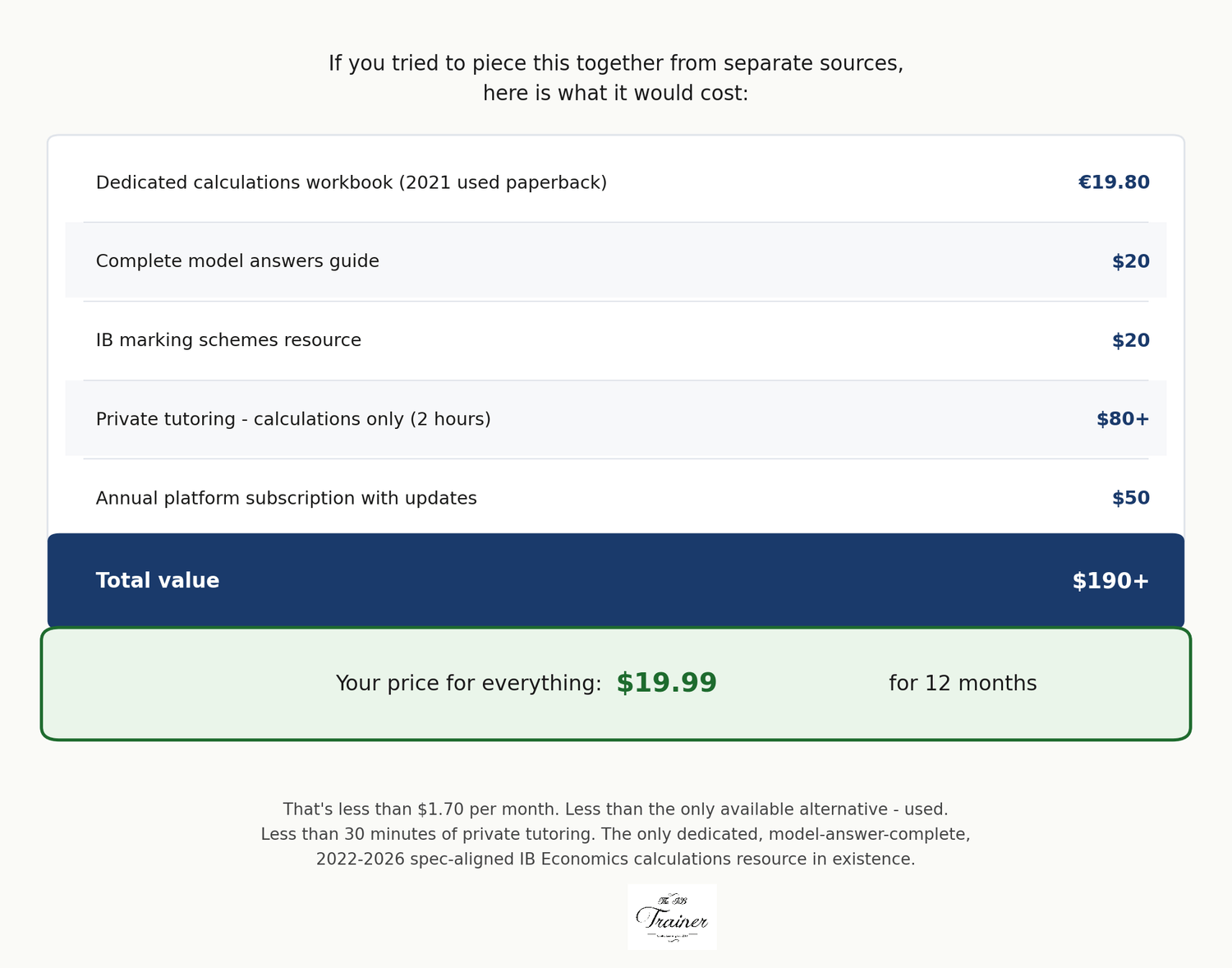 The market reality: In 2026, the only dedicated IB Economics calculations alternative is a 93-page workbook published in 2021 - written before the current IB 2022 specification, available at €19.80 for a used copy.