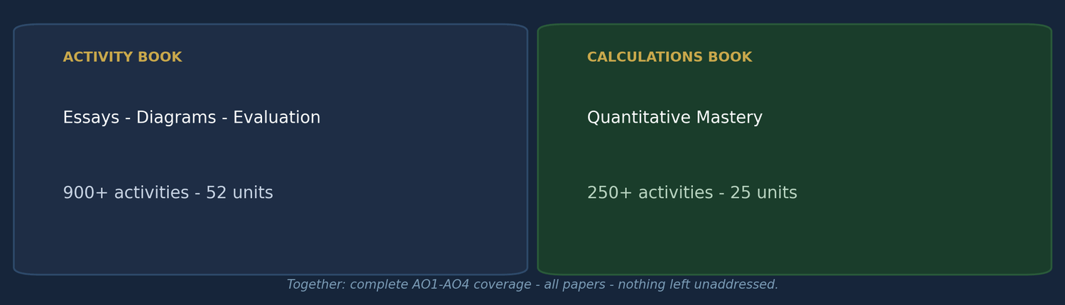 The Activity Book builds your essay writing, diagram skills, and evaluation. The Calculations Book builds your quantitative mastery. Together, they cover every Assessment Objective and every exam format - leaving no gap in your IB Economics preparation.